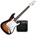 Fender Stratocaster electric guitar (3-tone sunburst), strings, picks, a strap, Squier SP-10 amp, and a 10-foot cable.