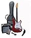 Package features everything you need to start playing: Guitar, Guitar Amp, Instructional DVD, Guitar Bag, Strap, and Cable! A great guitar package for you young beginner: Scaled Down Guitar is about 3" shorter and 2" narrower. It also makes a great travel guitar. Guitar has a dual cutaway solid Alder body allows access to the highest frets, and die cast chrome Tuners. The body is contoured for hours of comfortable play. It has three single coil pickups, one volume and two tone controls plus a five way pickup selector switch to create all of today's great sounds. Guitar is equipt with vintage fulcrum bridge with six adjustable saddles and truss rod adjustable Maple neck, Rosewood fretboard, 21 jumbo frets. Actual weight is only 8.5 lbs Overall length is 39" including the strap button Scale length is 24" Width at the widest point is 13" Width of the neck at the nut: 1 5/8"; at the 22st fret: 2 1/8" Body thickness is 1 3/4". GA-1065 10 Watt Guitar Amp features : 10 Watts of power through a specially design 5.5" speaker Master Volume Control Two Band EQ with Bass and Treble controls Headphone jack for quiet practice Weight of amp: 6.5lbs Overall length of guitar is 36 ¾". Width at widest point is 11 ½" Width of the neck at the nut: 1 1/2"; at the 21st fret: 2 1/8" Other items include:10' instrument cable to connect your guitar to your amp EB400 Guitar Bag to protect your guitar when your not playing. The QT-15 Quick Tune guitar tuner helps you tune your instrument and the included guitar strap makes it easy to handle Read more