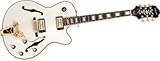 The Epiphone Limited Edition Emperor Swingster Royale Electric Guitar that outclasses other hollow-body guitars in its price range! World famous for making some of the best and most innovative hollow-body guitars, Epiphone conjures up some of it's past with the Emperor Swingster. Starting with the same body and neck as used on their Emperor-II guitar and made famous by the jazz master himself, Joe Pass, Epiphone swings into action and turns it into a serious twangin', rock-a-billy slingin', country flingin' machine! Classic Construction with SwingBucker Pickups! With it's hand-scalloped arched spruce top combined with a laminated arched-back maple body and glued-in 3-piece hard maple neck, the Swingster has what it takes to satisfy any professional's demand for great tone. At the heart of the guitar are Epiphone's SwingBucker pickups and a sophisticated series/parallel electronic switching package. Specially designed for the Swingster, the humbuckers offer no hum performance and feature classic Alnico-V magnets, enamel wire and over-wound coils for the perfect combination of warmth and bite. Series/Parallel Switching. Two push/pull Tone controls allow you to change each pickup's output individually from parallel to series wiring creating a palette of useful sounds to tap into ranging from warm humbuckers to "quacky" single-coil type sounds and everything in-between. Of course, any swinging machine needs a vibrato and the Swingster is no exception featuring a Bigsby Licensed B30 with original style "wire" handle as preferred by "Certified Guitar Player" and legend, Chet Atkins. But wait... there's MORE! Unlike some, Epiphone spares no expense by adding a "pinned" Tune-o-matic bridge with roller saddles for smooth operation and accurate return to pitch, which is preferred when using a vibrato. Loads of Bling Topping it all off are Epiphone's trademark, multi-bound headstock with the classic mother-of-pearl "vine" inlay, premium gold Grover tuners and a multi-bound, 20 Read more