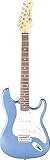 Classic style, double cutaway, solid body, maple neck, rosewood fingerboard, 3 single coil pickups, 5-position selector switch, 1-v and 2-t, full face white pickguard, standard temolo and die-cast machines, metallic blue Read more